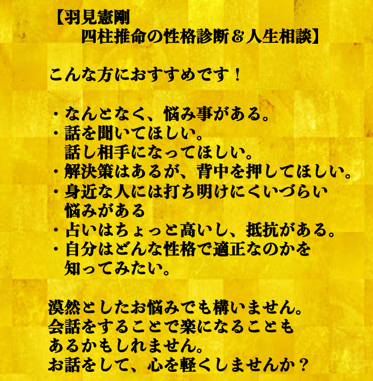 羽見憲剛が、四柱推命をベースにあなたに親身に寄り添い話を聞きます。